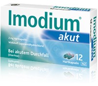 Imodium® akut, Imodium® akut lingual, Imodium® akut Softkapsel. Wirkstoff: Loperamidhydrochlorid. Zusammensetzung: Arzneil wirks. Bestandt.: 1 Hartkapsel / Schmelztbl. / Weichkapsel enth. 2 mg Loperamidhydrochlorid. Sonst. Bestandt. Hartkapsel: Lactose-Monohydrat, Maisstärke, Talkum, Magnesiumstearat, Gelatine, Farbstoffe der Kapselhülle (Titandioxid, Indigocarmin, Eisen(III)-hydroxid-oxid, Eisen(II,III)-oxid, Erythrosin). Schmelztabl.: Gelatine, Mannitol, Aspartam, Natriumhydrogencarbonat, Pfefferminz-Aroma (enth. Maltodextrin, Levomenthol). Weichkaps.: Weichkapselfüllung: Propylenglycolmonocaprylat, Propylenglycol, H2O ger. Weichkapselhülle: Gelatine, Propylenglycol, Glycerol, Farbstoff, Phospholipide (Soja), mittelkettige Triglyceride. Anwendungsgebiet: Symptomatische Behandlung akuter Diarrhöen für Jugendliche ab 12 Jahren und Erwachsene, sofern keine kausale Therapie zur Verfügung steht. Eine über 2 Tage hinausgehende Behandl. nur unter ärztl. Verordnung u. Verlaufsbeobachtung. Warnhinweis: Hartkapsel enth. Lactose. Schmelztabl. enth. Aspartam, Levomenthol. Weichkapsel. enth. Phospholipide (Soja). Gegenanzeigen: Allergie gegen Loperamid, einen der sonst. Bestandteile, Schmelztabl. zusätzl. gegen Levomenthol, Weichkapsel. zusätzl. gegen Soja, Erdnuss; Bakterielle Darmentzündung durch in die Darmwand eindringende Erreger, z. B. Salmonellen, Shigellen, Campylobacter; Zustände, bei denen e. Verlangsamung d. Darmtätigkeit wegen mögl. Folgeerscheinungen zu vermeiden ist, wie Ileus, Megacolon, toxisches Megacolon. Sofort absetzen bei Obstipation, aufgetriebenem Leib o. Ileus; Durchfälle mit Fieber und/oder blutigem Stuhl; Durchfälle während od. nach der Einnahme v. Antibiotika (pseudomembranöse [antibiotikaassoziierte] Colitis); Akuter Schub einer Colitis ulcerosa; Absolut: Kinder < 2 Jahren, nicht ohne ärztliche Verordnung: Kinder zwischen 2 u. 12 Jahren, chronische Diarrhö, bestehende od. durchgemachte Lebererkrankung (verlangsamter Abbau mögl.). Nicht empfohlen in d. Stillzeit. Schwangerschaft: Strenge Indikationsstellung. Nebenwirkungen: Häufig: Kopfschmerzen, Schwindel; Obstipation, Übelkeit, Flatulenz. Gelegentlich: Schläfrigkeit; Abdominelle Schmerzen und Beschwerden, Mundtrockenheit; Schmerzen im oberen Abdominaltrakt, Erbrechen; Dyspepsie; Hautauschlag. Selten: Überempfindlichkeitsreaktionen, anaphylaktische Reaktionen (einschließlich anaphylaktischem Schock), anaphylaktoide Reaktionen; Bewusstlosigkeit, Stupor, Bewusstseinstrübung, erhöhter Muskeltonus Koordinationsstörungen; Miosis; aufgeblähter Bauch; Ileus (einschließl. paralytischem Ileus), Megacolon (einschließl. toxischem Megacolon); Bullöse Reaktionen (einschließlich Stevens-Johnson Syndrom, toxisch epidermale Nekrolyse, Erythema multiforme), Angioödem, Urticaria, Pruritus; Harnretention; Müdigkeit; Schmelztabletten zusätzlich Glossodynie.