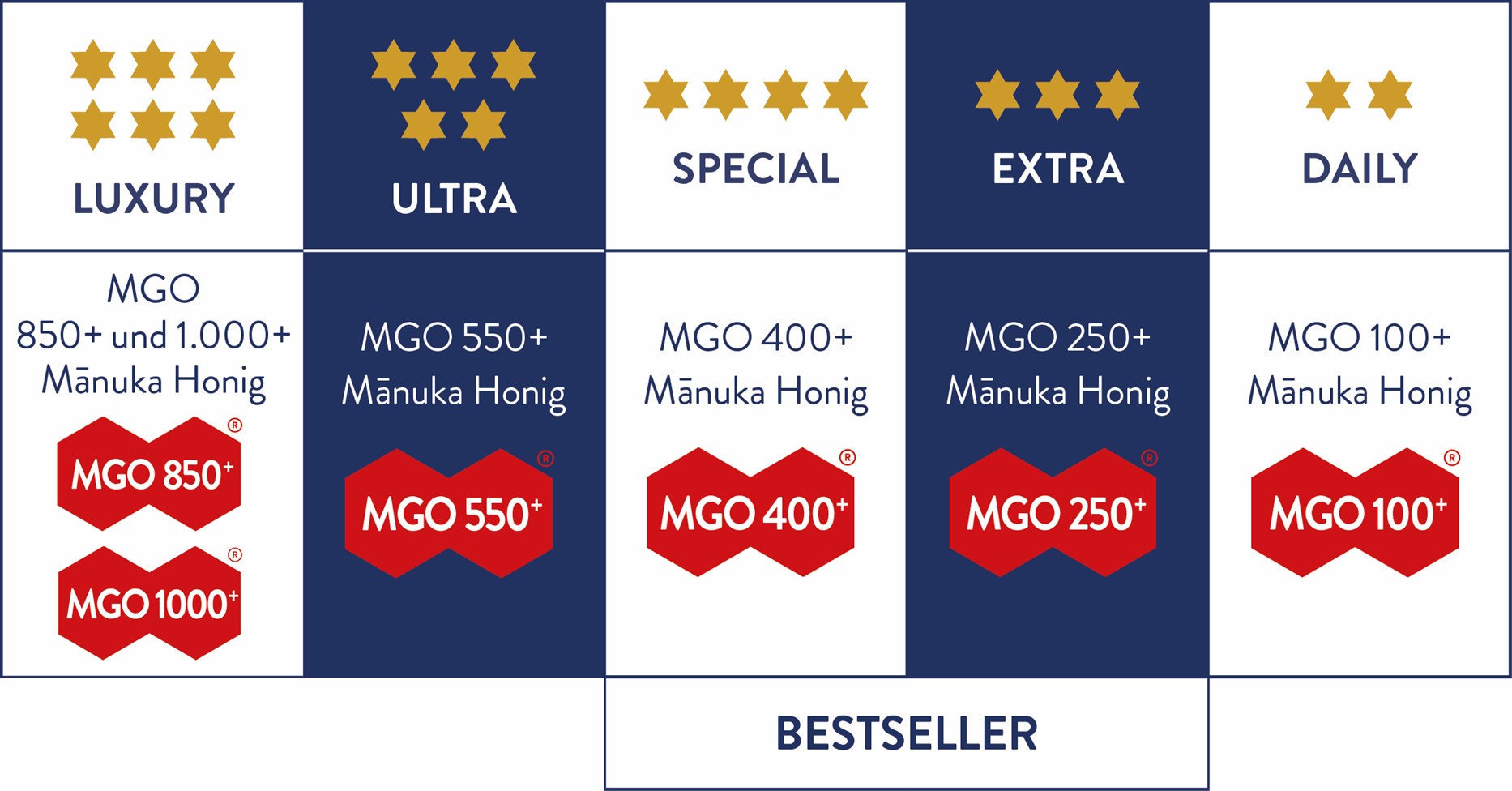 Die Originale von Mānuka Health sind in verschiedenen MGO-Stärken erhältlich: