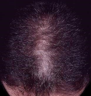 Im ersten Schritt bilden sich an den Schläfen Geheimratsecken. Später kommt es am Oberkopf zu einer kahlen Stelle, die sich immer weiter ausweitet. Schließlich bleibt nur noch ein Haarkranz.